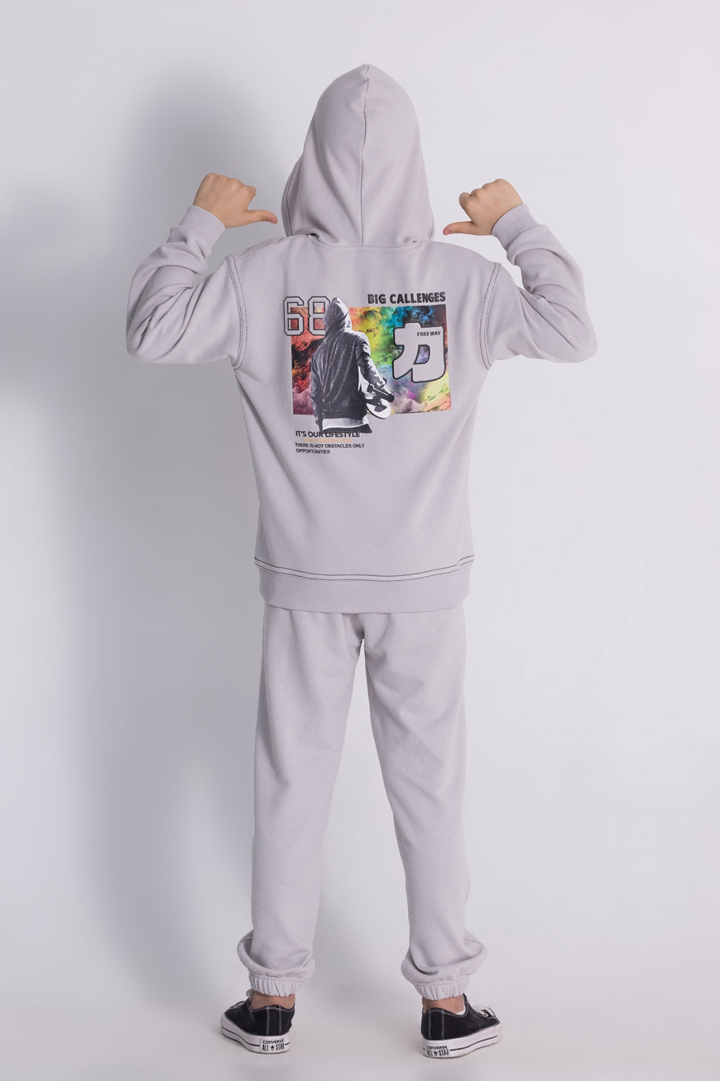 Takım, kapüşonlu üst ve lastikli paça alt parçadan oluşur.