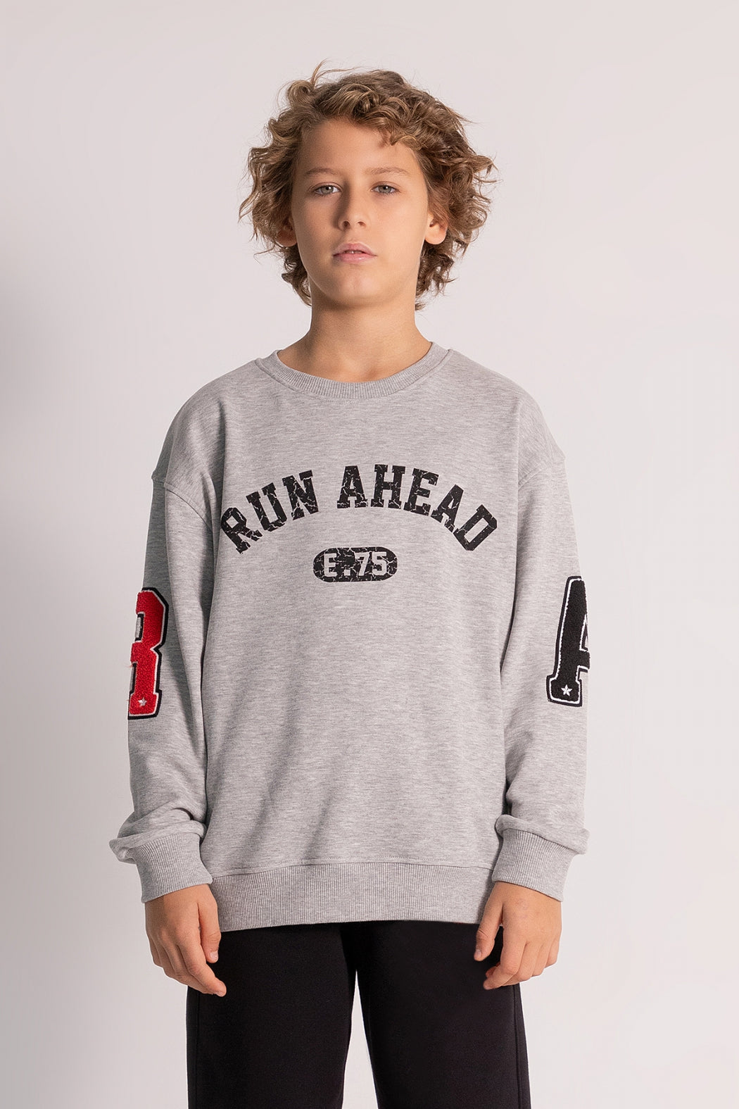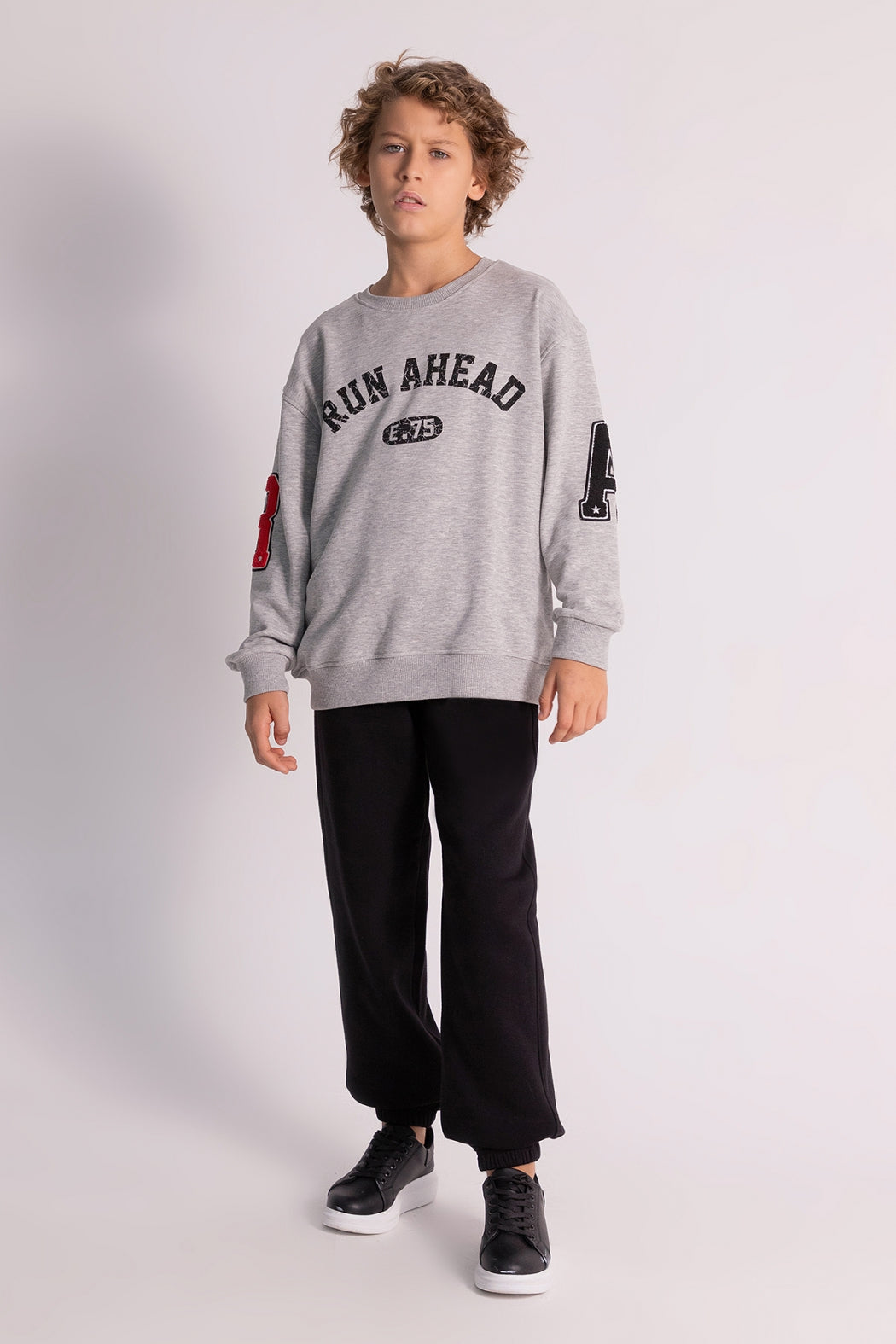 - Üst parçada "Run Ahead" yazı ve kol nakış detaylarıyla dinamik bir stil sunar.