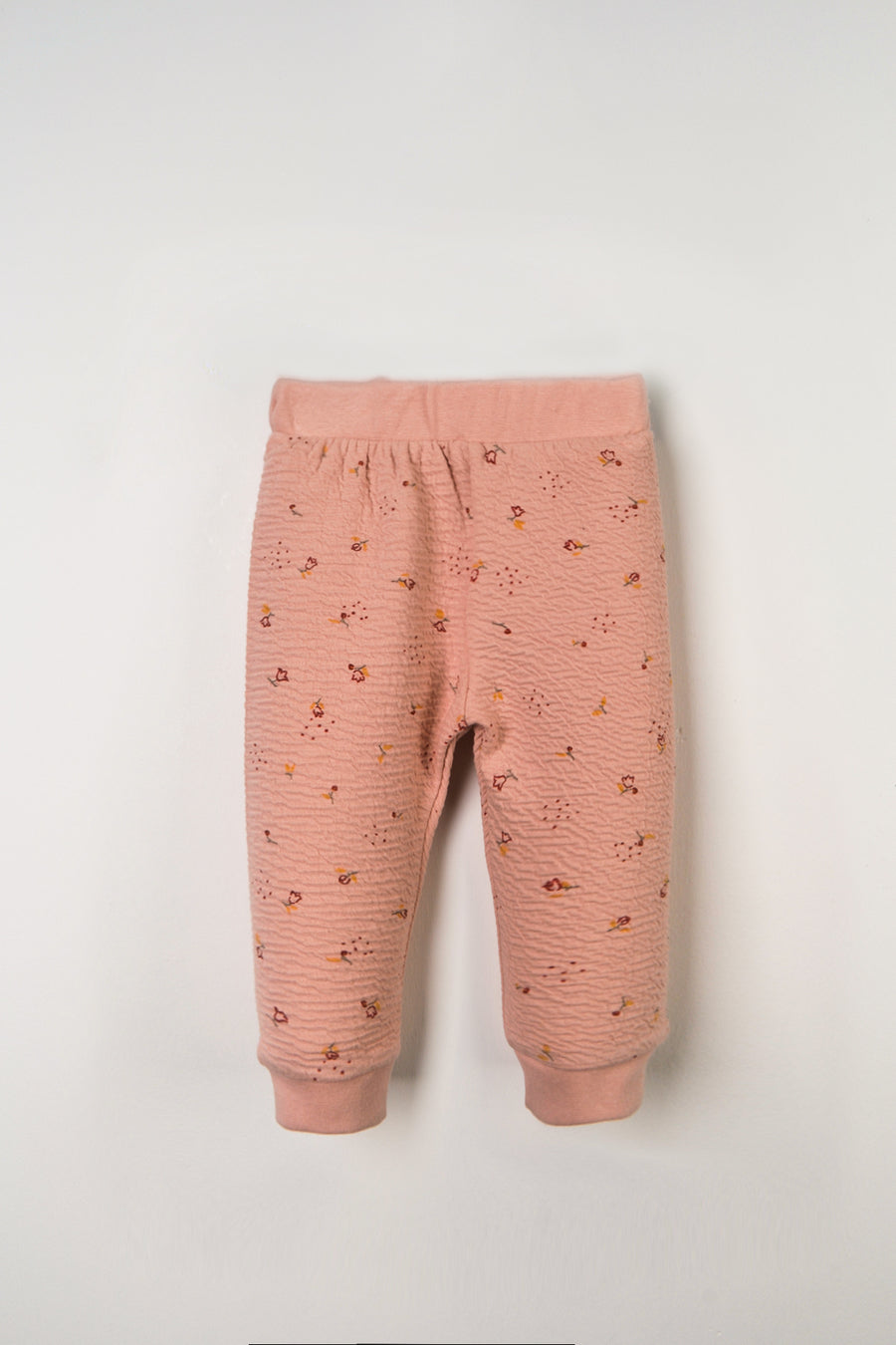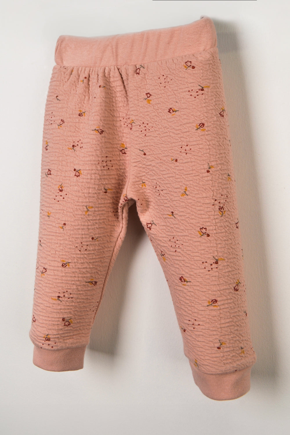 Minimal çiçek desenleriyle süslenmiş ve kabartmalı dokuma tekniği ile üretilmiş olan bu pantolon, modern ve şık bir görünüm sunar. Elastik beli sayesinde bebeğinizin rahat hareket etmesine olanak tanırken, bilek kısmındaki ribanalı detaylar pantolonun kaymasını önler ve konforlu bir kullanım sağlar.