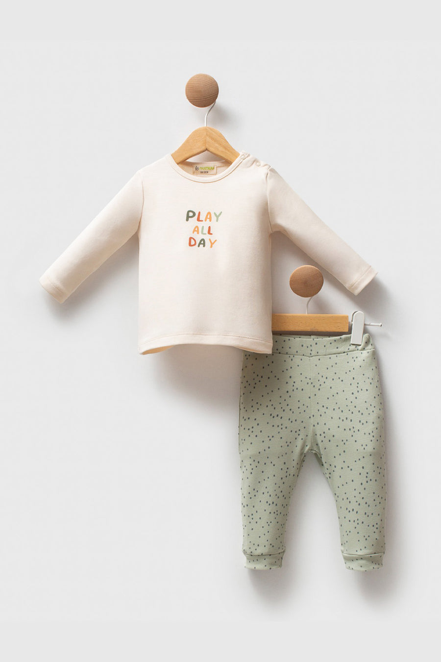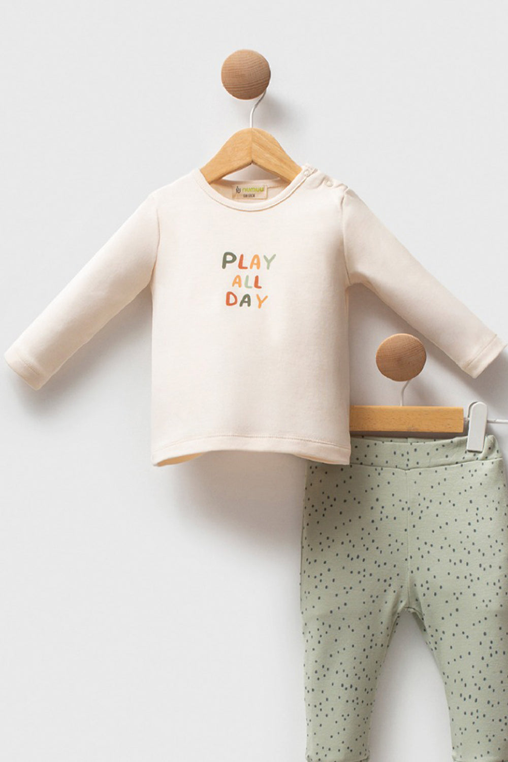 Takımın üst parçası, açık krem rengi zemin üzerine renkli “Play All Day” yazı baskısıyla hareketlenirken, alt parçası ise yeşil zemin üzerindeki minik nokta desenleriyle tamamlayıcı bir şıklık sunuyor.
