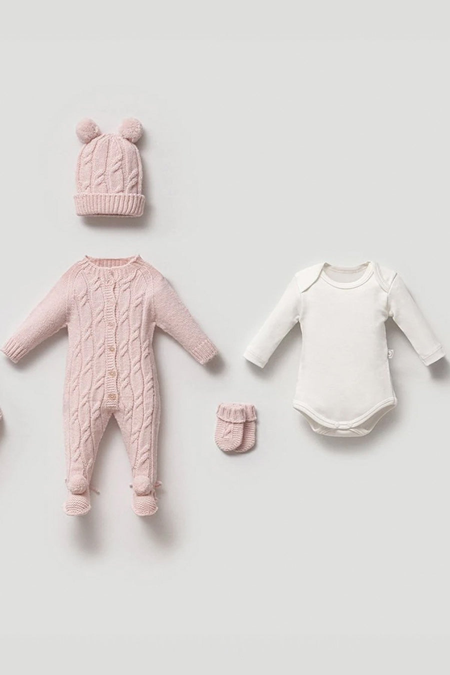 Örgü Desenli Patikli Tulum Battaniye Bere Eldiven ve Body Kız Bebek Hastane Çıkış Seti